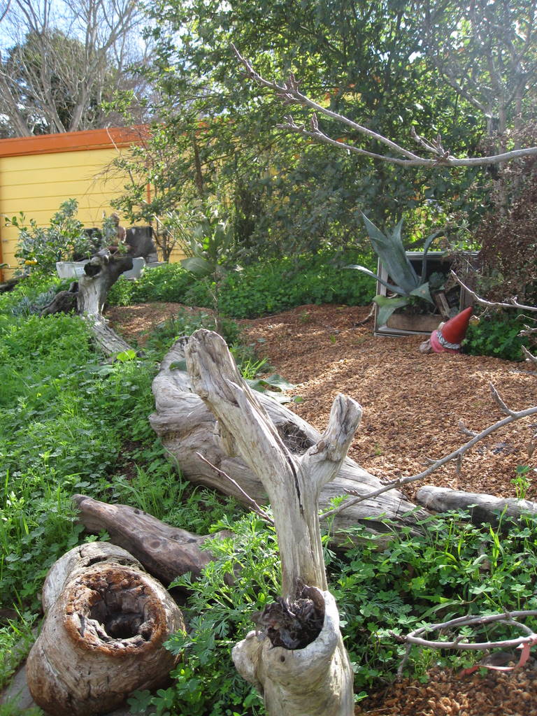 Even though it is the cool season (one can hardly call it “winter” in Santa Cruz), his front yard is flush with food, herbs and habitat. Ken noted that he likes to let things run a little wild in his yard, but he pointed out that what many might mistake to be weeds, are in fact self-perpetuating sources of food that readily reseed and grow themselves with little to no input on his part. As you can see in the photos, even with a looser, wilder growth pattern, it is a beautiful landscape accented by driftwood and quirky garden art.